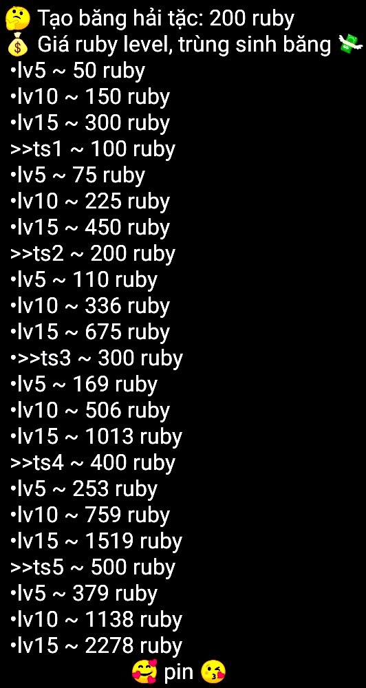 Ae nào đi trước rồi cho t hỏi bang từ lúc lv1 đến lv10 ts2 tốn tầm bn ruby ạ