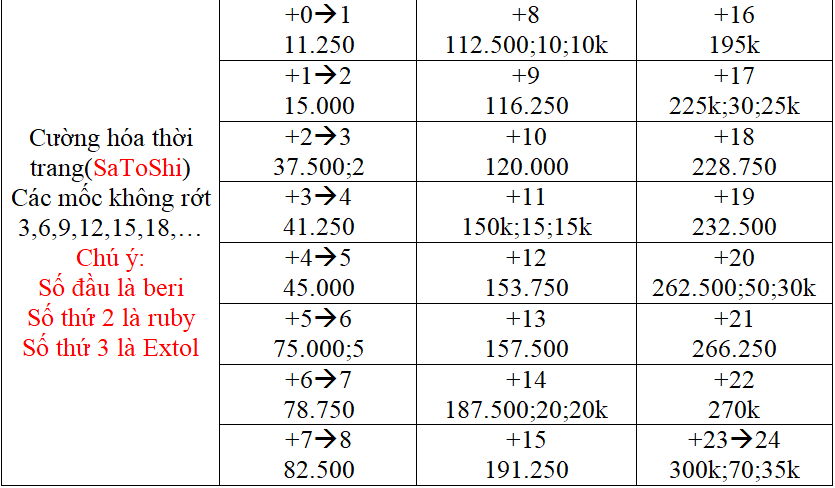 - Các cấp cường hoá 3,6,9,12,15,18... khi nâng cấp lên cấp cao hơn sẽ không bị rớt cấp