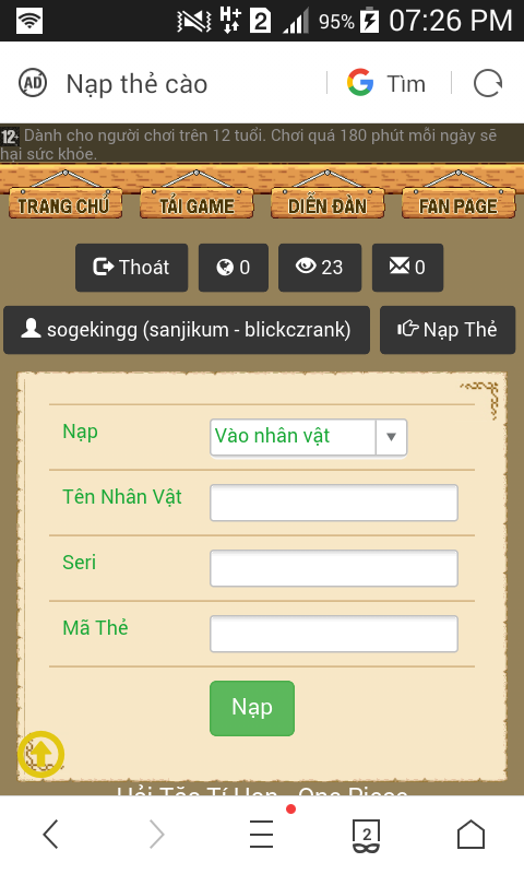Dành cho người chơi trên 12 tuổi. Chơi quá 180 phút một ngày sẽ hại sức khỏe.